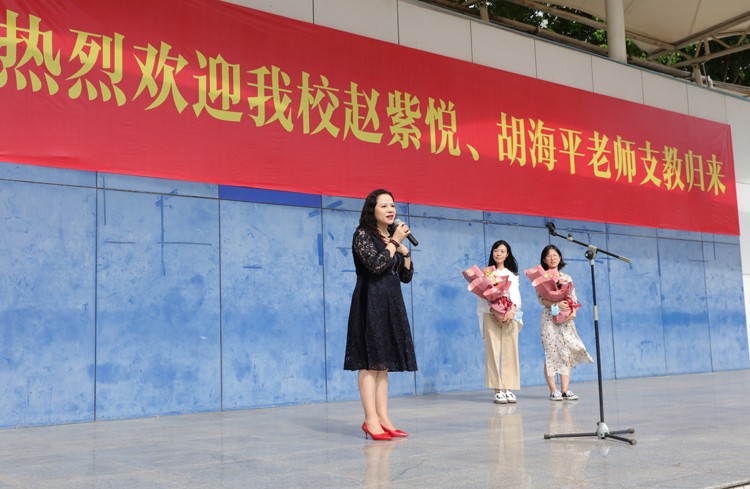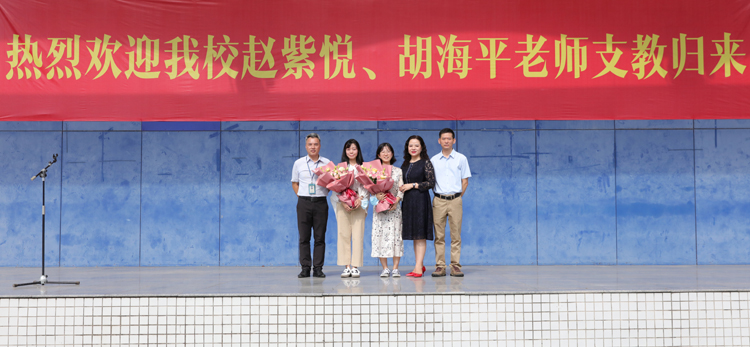 【本站讯】(报道:王瑛 摄影:刘旸)9月7日上午,我校为赴广西百色市特殊教育学校支教并顺利完成支教任务的赵紫悦、胡海平老师举行欢迎仪式。校党委书记、校长曹艳同志携全体班子成员出席仪式,并为两位支教老师献上了鲜花,全体师生参加了此次活动。